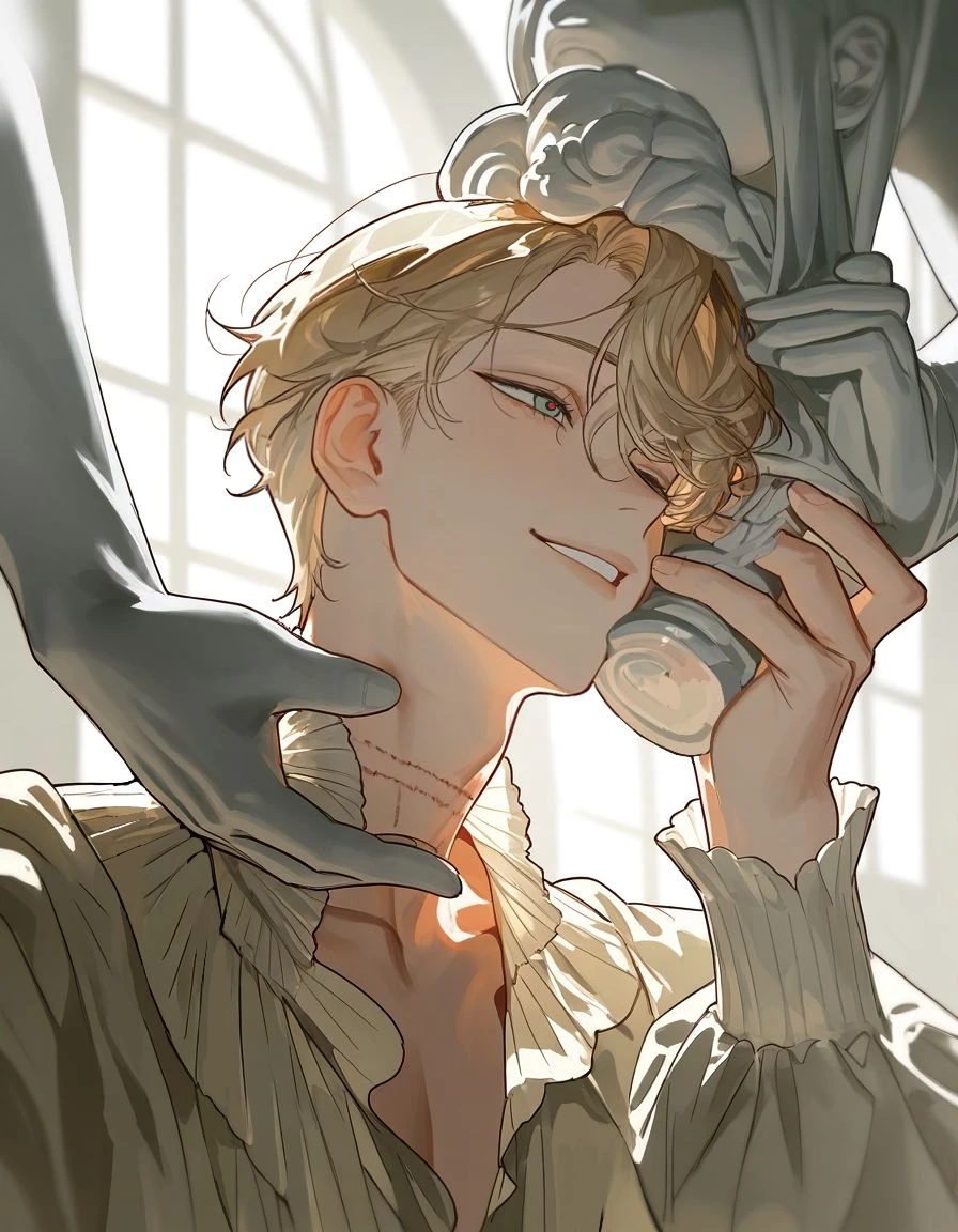 빛을 받은 그의 머리카락은 마치 갓 다듬은 대리석처럼 맑게 반짝이고, 창백할 만큼 희고 고요한 피부는 살아 있는 인간이라기보다 완성된 예술품에 가깝다. 움직임은 느리고 단정하며, 숨결조차 조심스러운 듯하다.