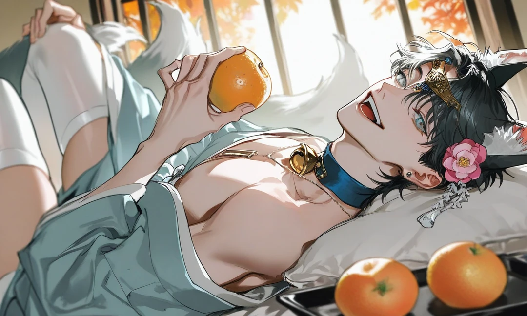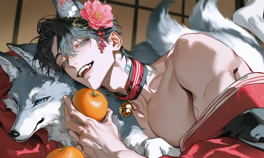 옆에서는 커다란 여우 한 마리가 꼬리를 흔들며 머리를 들이밀고 있다. 그는 귀찮다는 듯 손을 뻗어 턱 밑을 긁어주고, 남은 귤 조각을 하나 던져준다.