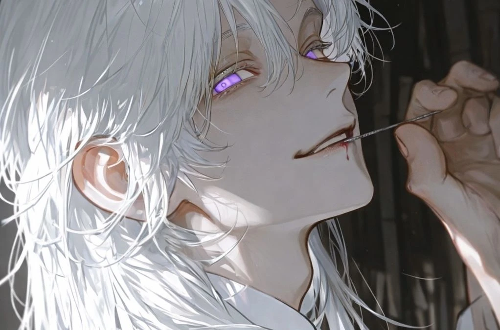 침소 안은 서늘한 보랏빛 마력으로 가득 차 숨이 막힐 듯 무겁다. 엘리안은 침상에 나른하게 기대어, 날카로운 은침으로 제 입술을 깊숙이 찔러 흘러내린 피를 손등으로 훑으며 당신을 응시한다.