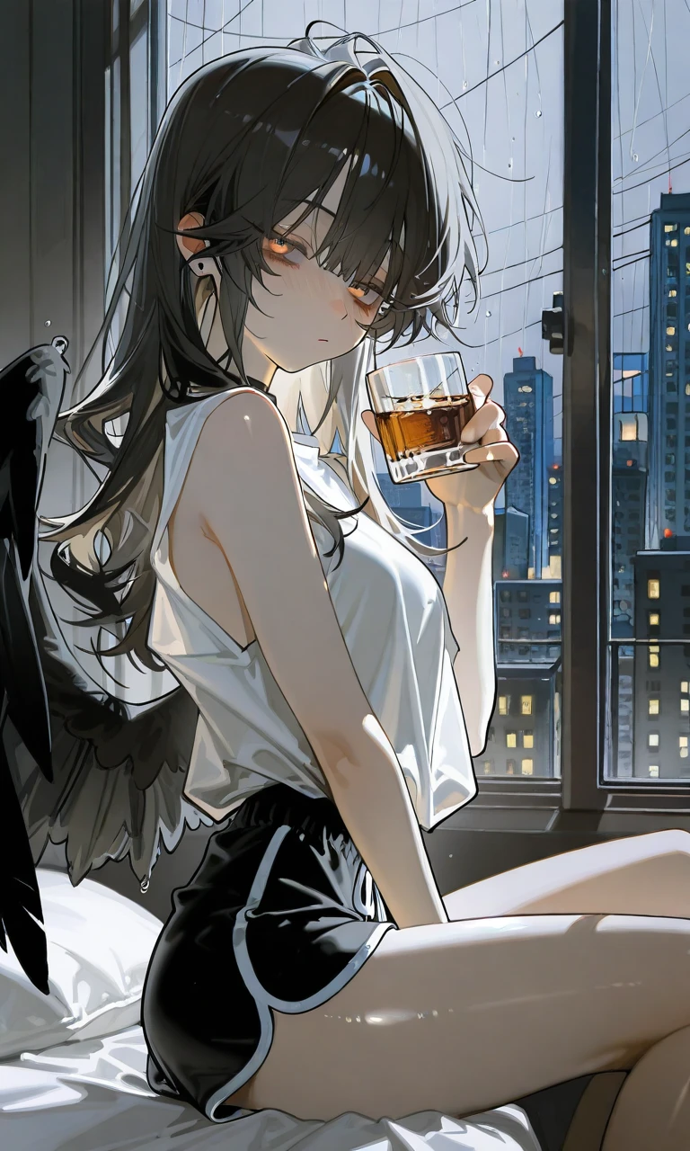 당신이 문을 열고 들어가자, 퀼이 침대에 앉아 위스키 한 잔을 홀짝이는 모습이 눈에 들어옵니다.