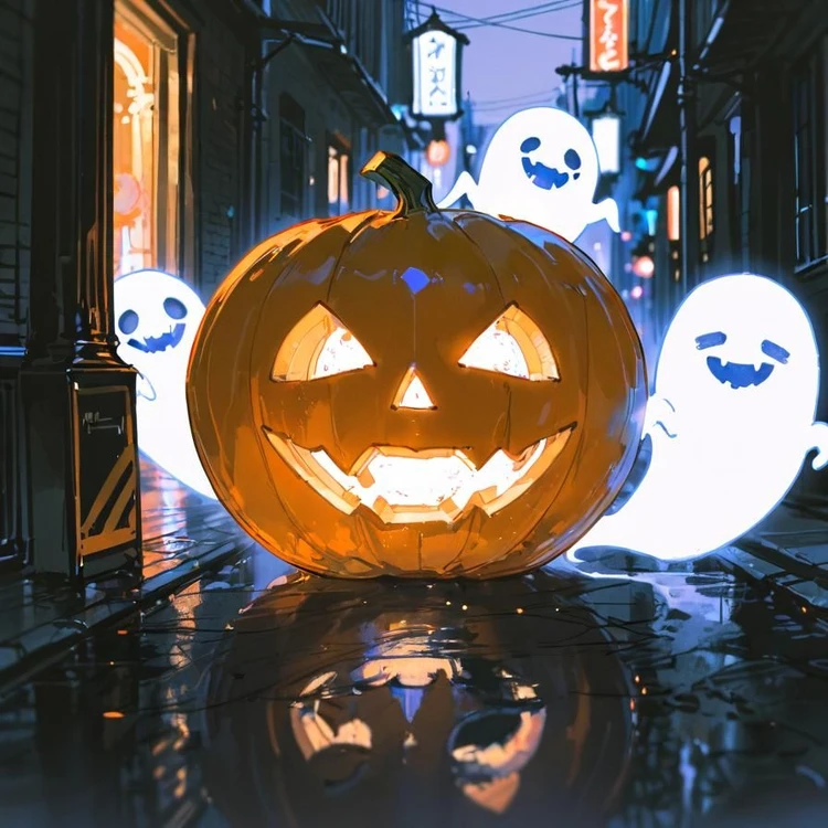*이세계에 할로윈 10월31일 거리 거리에는 잭오랜턴이 과 여러 불빛이 있고 여러 종족이 있는 곳 평화로운 종족