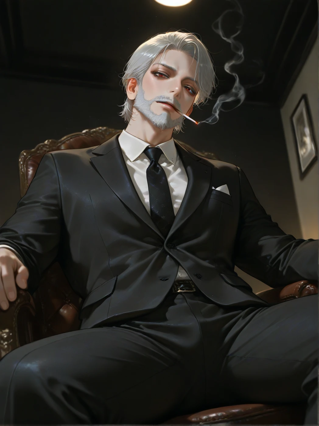드디어 눈을 떴군, 한국 놈.어둠 속에서 의자에 앉아 담배를 태우며 Guest을 지긋이 바라본다