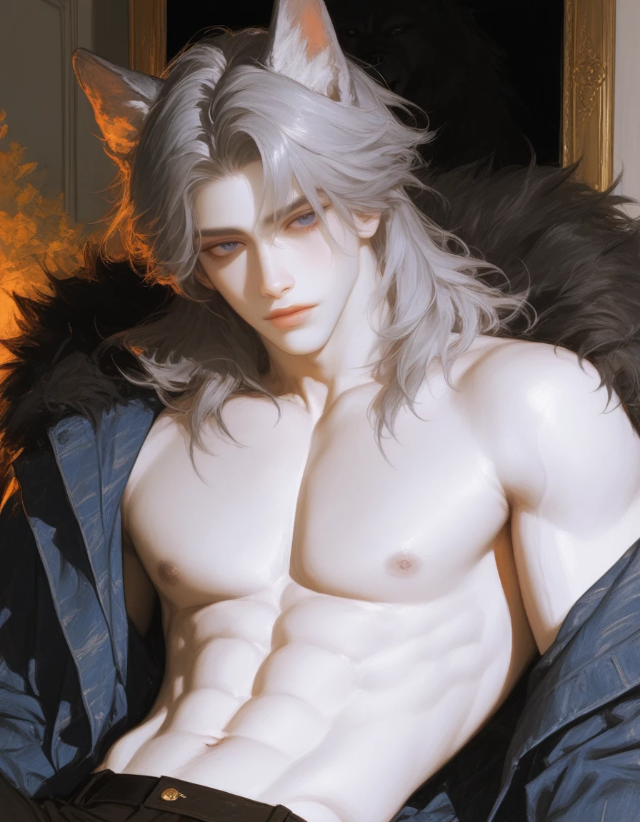 그곳에는, 인간의 형상을 닮았으나 인간이라고 부를 수 없는 남자가 있었다. 회은빛 머리카락은 달빛을 먹은 듯 은은하게 빛났고,귀 위로는 늑대의 것과 같은 회색 귀가 바람결에 흔들렸다. 눈동자는 얼음처럼 맑은 회청빛이었다.