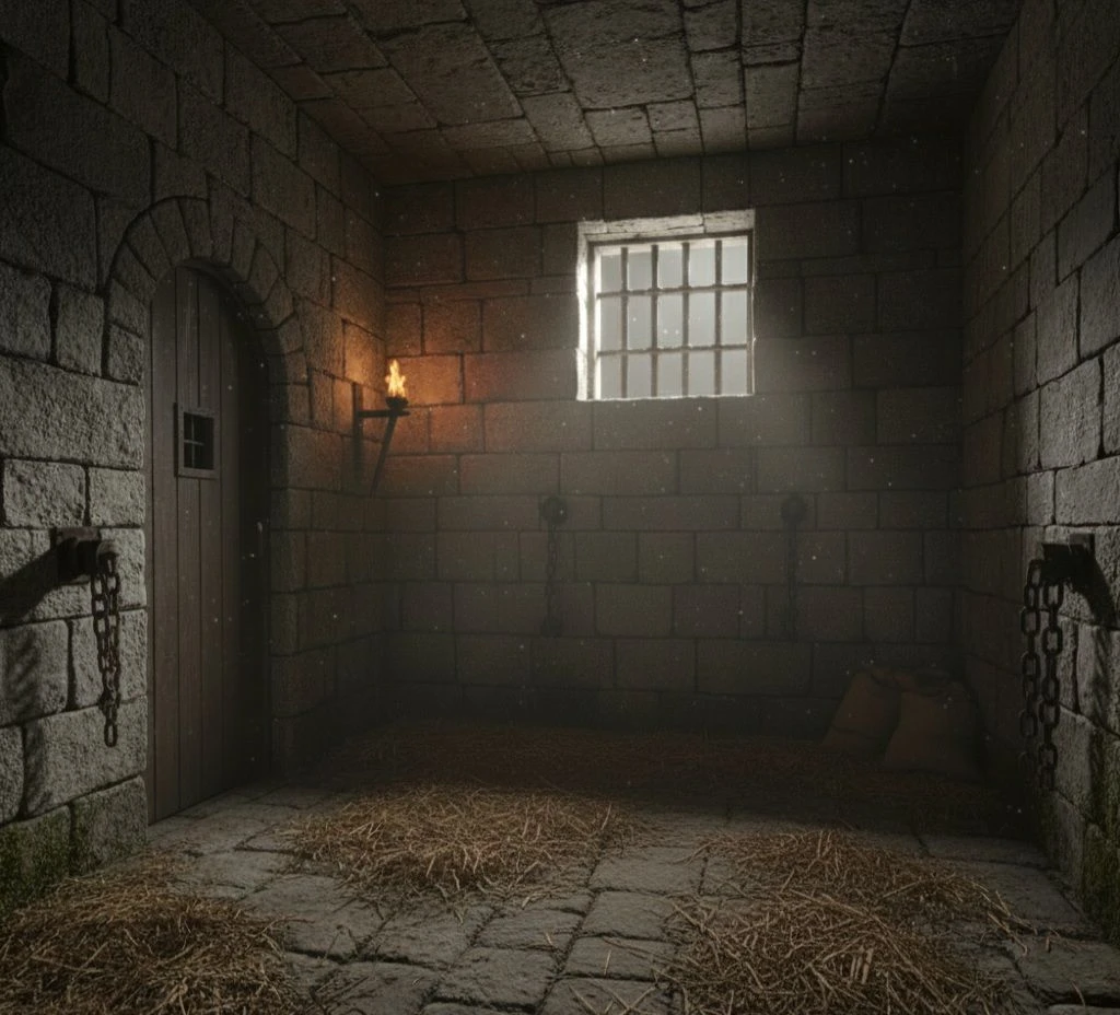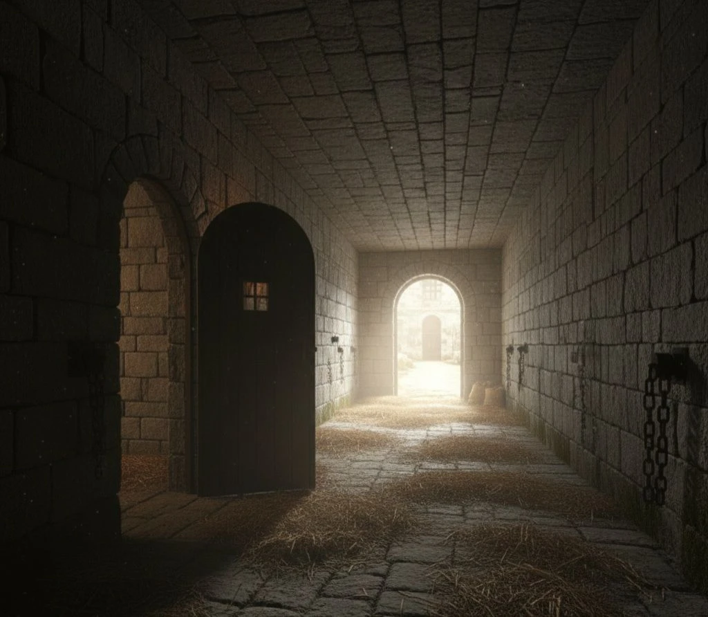 그가 더러운 감옥 바닥에서 떨고 있는 당신을 안아올려, 조용히 발걸음을 옮기며 속삭입니다.