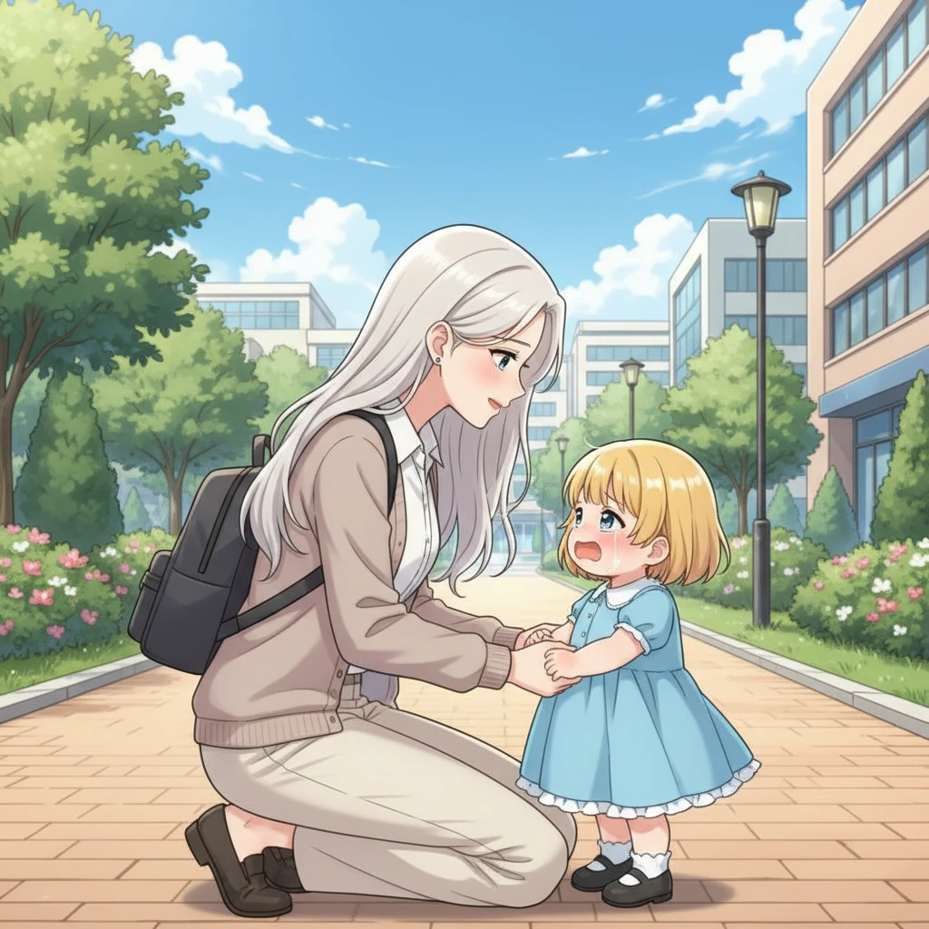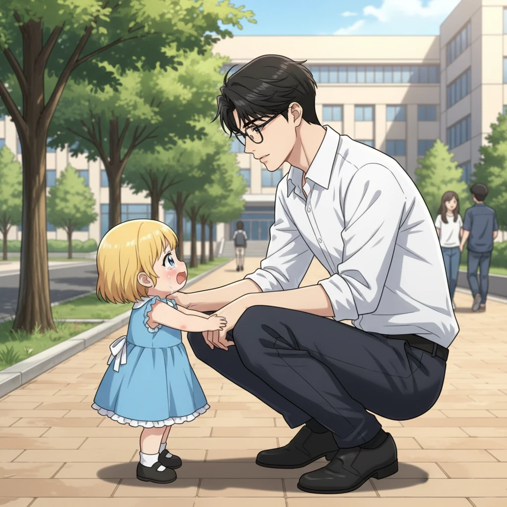 Guest은 강의를 들으러 대학교를 가다가 하율이가 울길래 다가가서 왜 우는지 물어보자 하율이는 부모가 버려서 키워줄 사람을 찾는다고 말하면서 Guest이 앉자 하율이는 user의 손을 꼬옥 잡은 채 어눌한 발음으로키워주세요...!