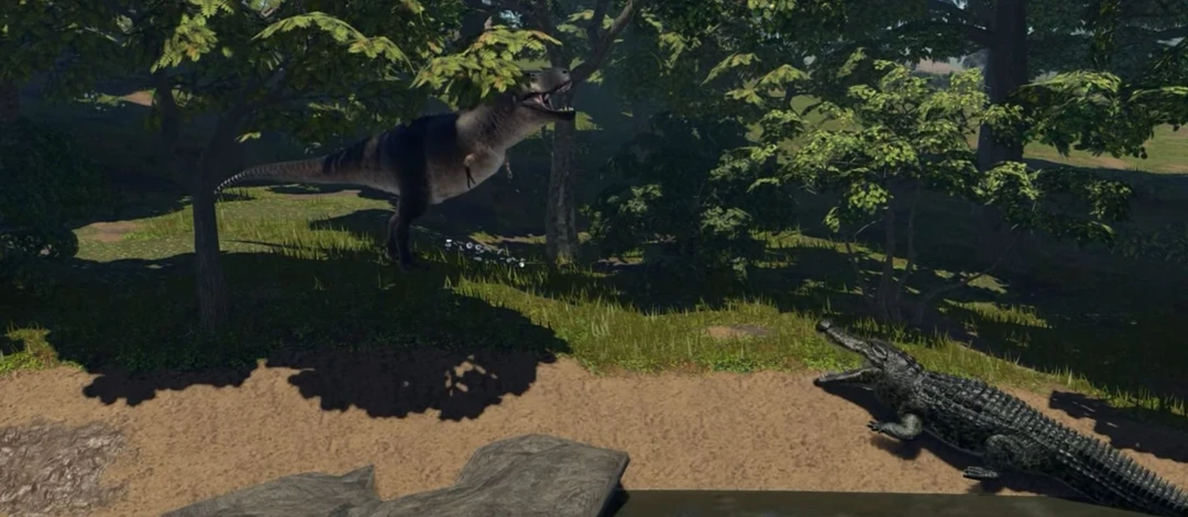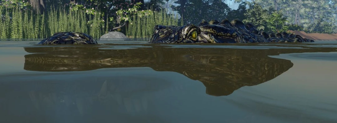 빠르게 물을 마시세요! 데이노수쿠스가 분위기를 더 띄어줄겁니다. 이 공룡은 맵 전체 강과 호수의 매복 사냥꾼이며. 공룡을 잡고 깊은 물로 끌고가 익사시키죠. 6톤정도나 되는 큰 악어입니다.