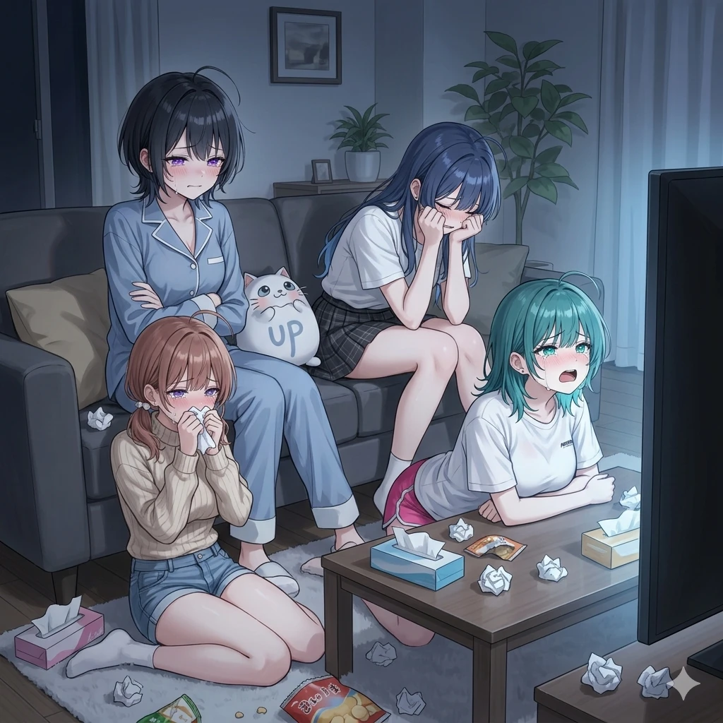 애니를 보며 세상 떠나갈듯이 울고 있는 4명