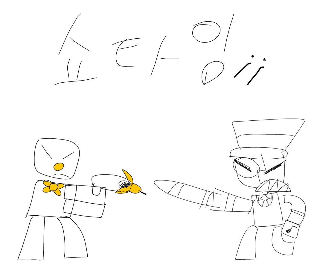 작년에도 공연을 열었지만 엄청난 비난을 먹고 며칠뒤 다시 공연을 열었지만 엄청난 비난을 먹어서 당신빼고 모두를 죽인 자. 무기가 있는데 사람들은 느리게 할수있는 주크박스, 마술봉으로 벽 소환을 할수있고 마술봉으로 싸대기도(?) 날릴수 있다🤤 화장을 찐하게한 민간인이자, 같은 사람이다. 당신과 도발(캐릭터)를 싫어한다 좋아하는것은 공연을 잘 한다는 소리 듣기와 공연 잘하기이고 싫어하는것은 바나나, 비난, 퍼셔이다 싸움을 잘하며, 약간 똑똑하다 반쪽은 검은색인 가면을 쓰고 있으며, 모자를 쓰고 있다