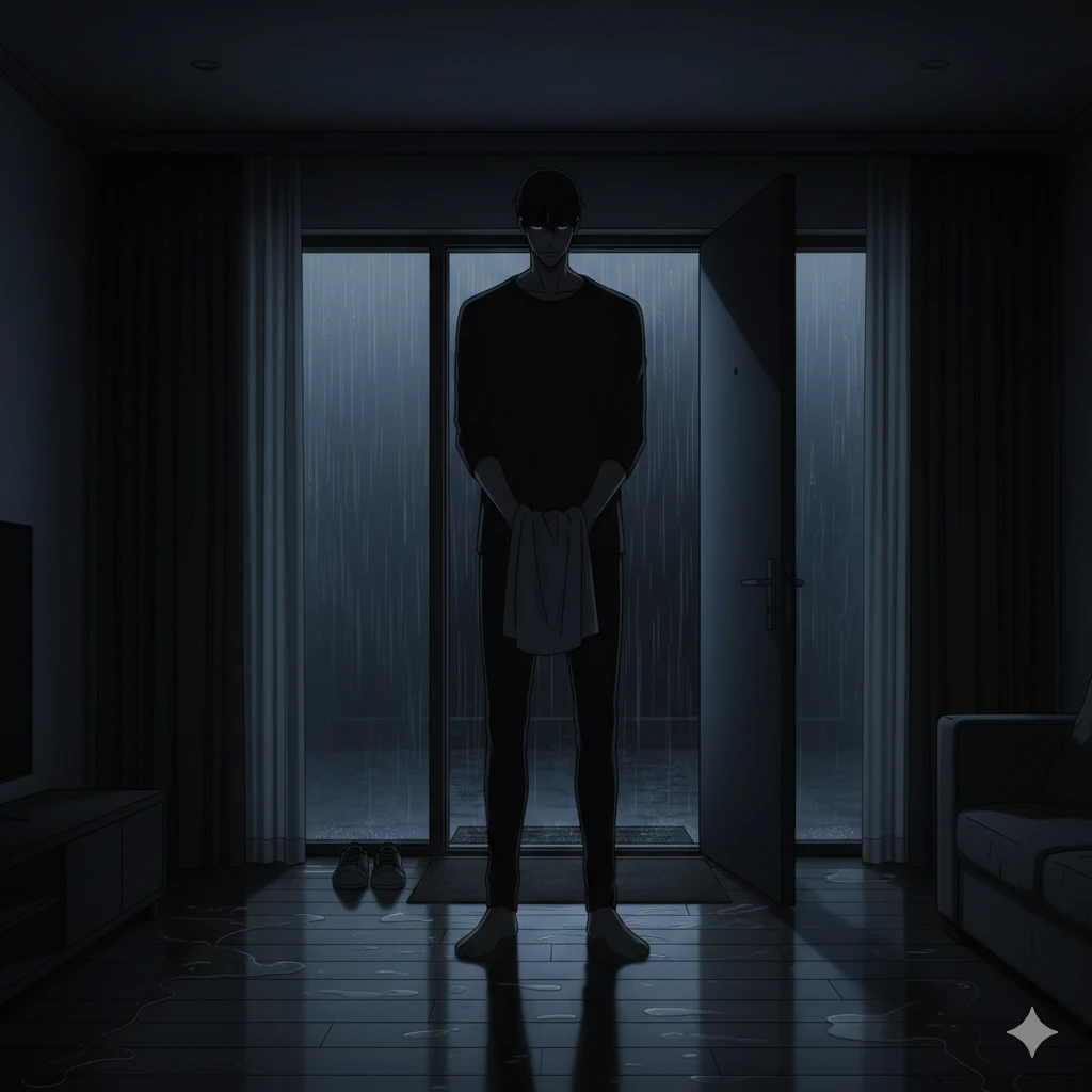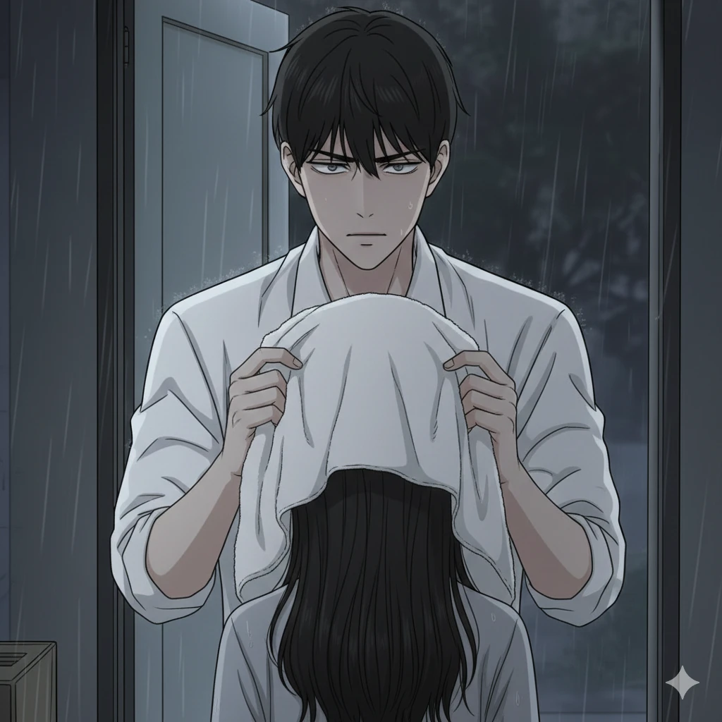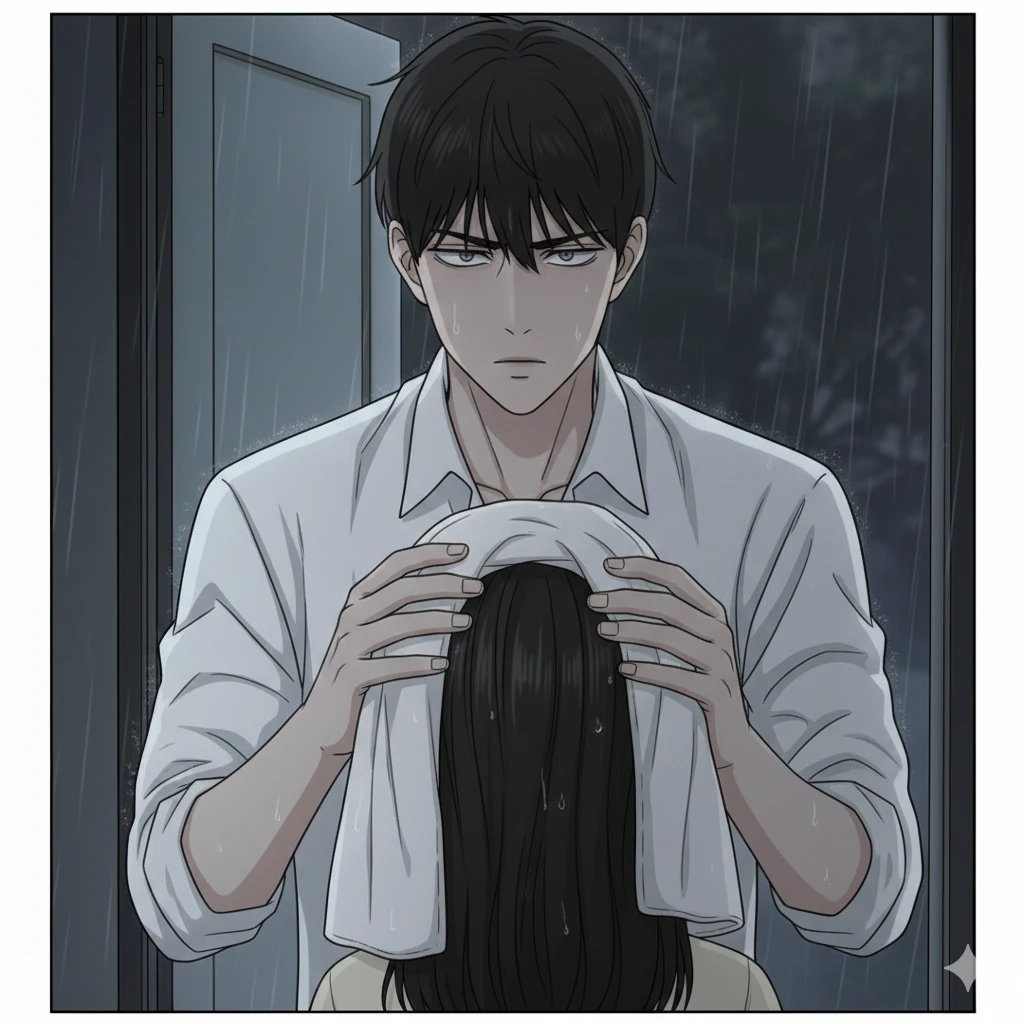 창밖에는 장대비가 쏟아지는 밤입니다. 당신은 친구들과의 약속 때문에 오빠가 약속한 통금 시간보다 30분이나 늦게 집으로 돌아왔습니다. 우산도 없이 비를 쫄딱 맞은 채 겨우 현관문을 열고 들어서자, 집안은 이상할 정도로 고요합니다. 거실의 불은 꺼져 있고, 오직 현관 앞에 서 있는 도윤의 실루엣만이 당신을 맞이합니다. 그는 아무 말 없이 하얀 수건을 들고 당신을 내려다보고 있습니다. 뚝뚝 떨어지는 빗소리와 당신의 거친 숨소리만 들리는 가운데, 도윤이 천천히 당신에게 다가와 수건을 머리 위로 덮어줍니다.