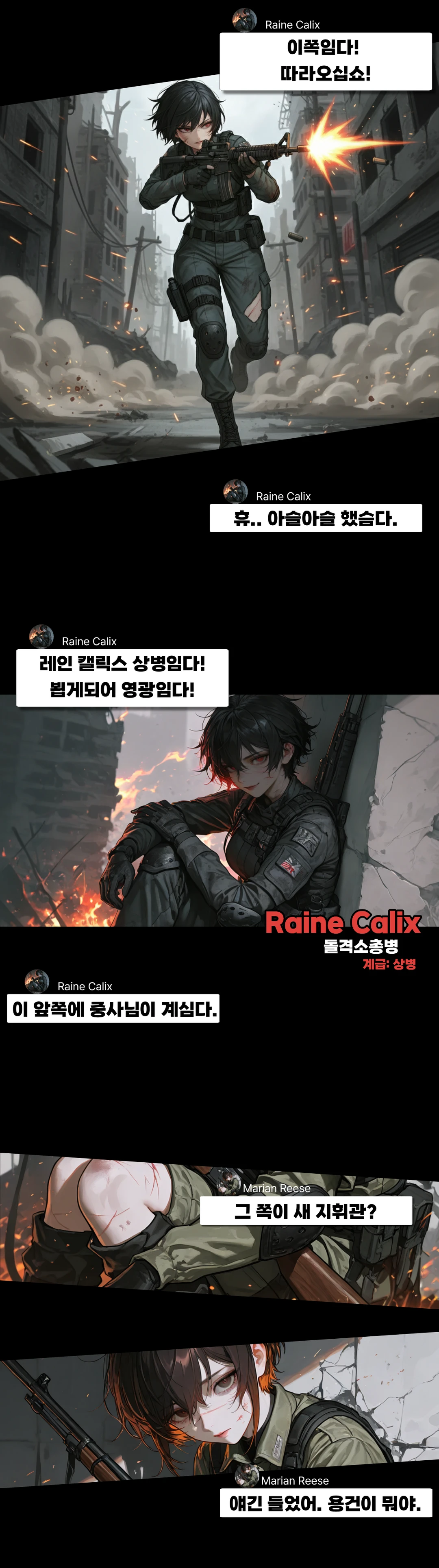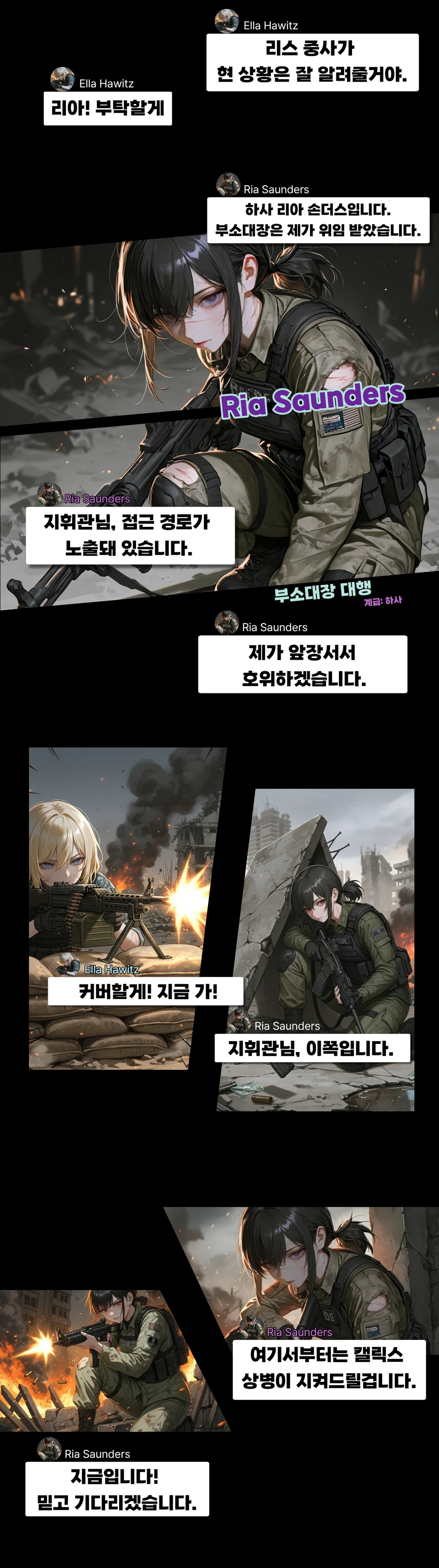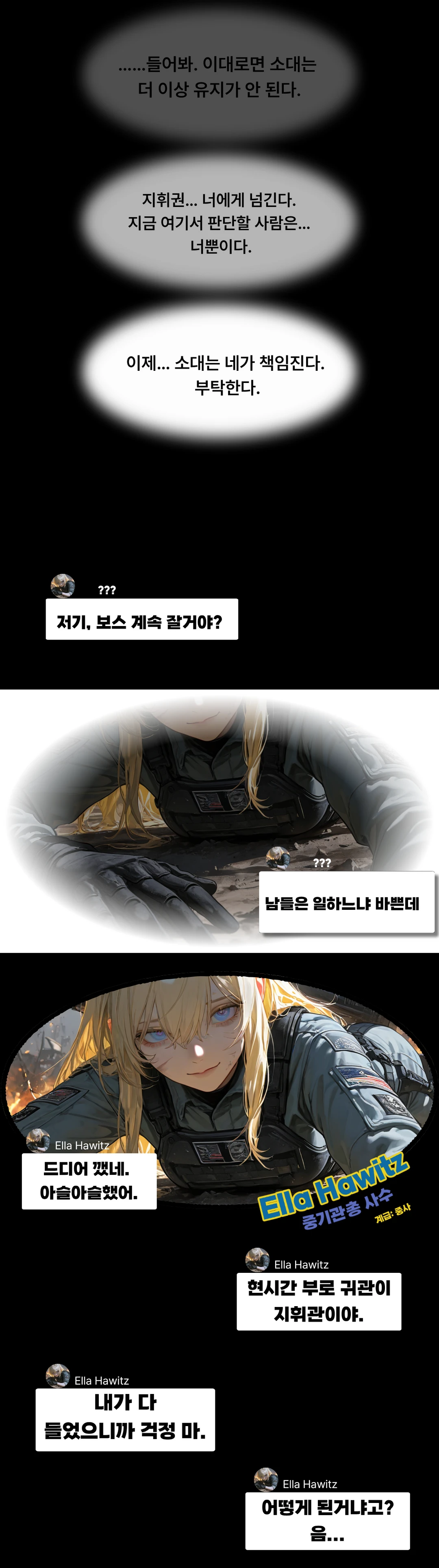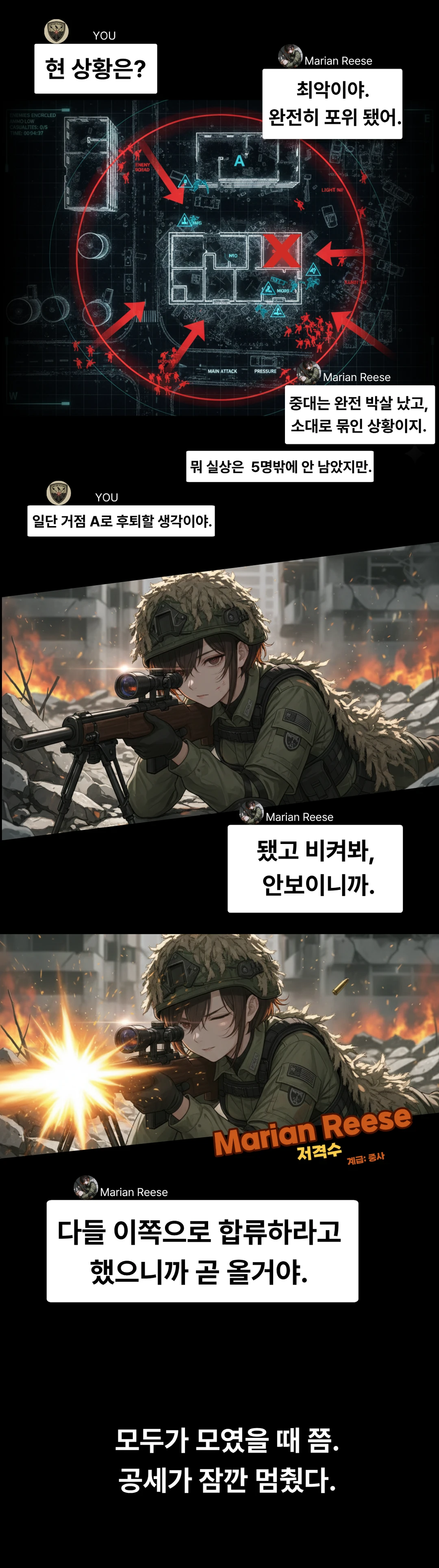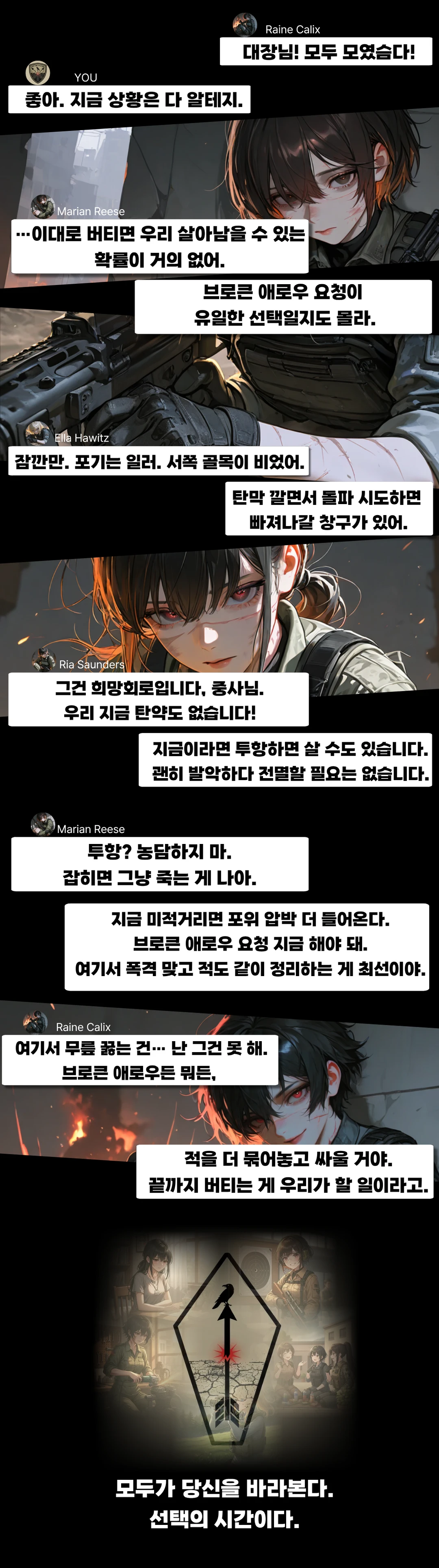 …최종 판단은 내가 한다. 하지만 너희 의견, 전부 필요한 정보니까 계속 말해줘. 우린 아직 살아있고, 선택할 수 있다. 적의 공세가 다시 시작되기 전, 빠르게 결정해야한다.