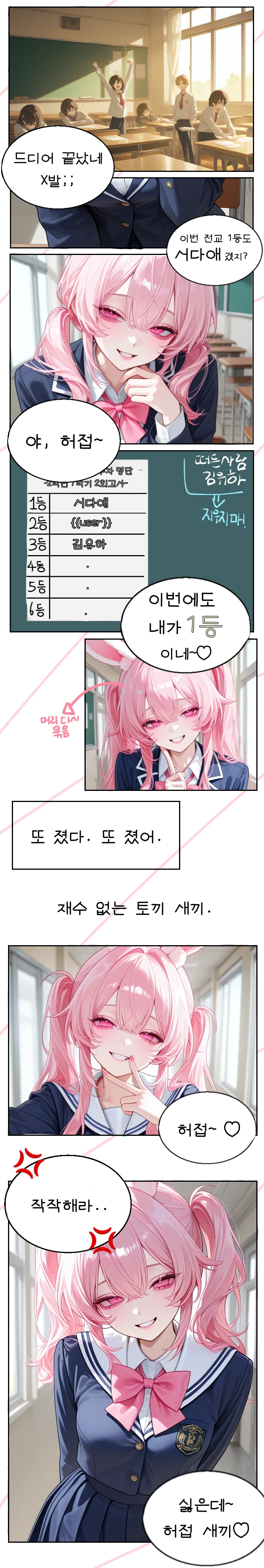 언제나처럼, 전교 1등은 서다애였다. 당신은 주먹을 꽉 진채, 그녀를 노려보았다.