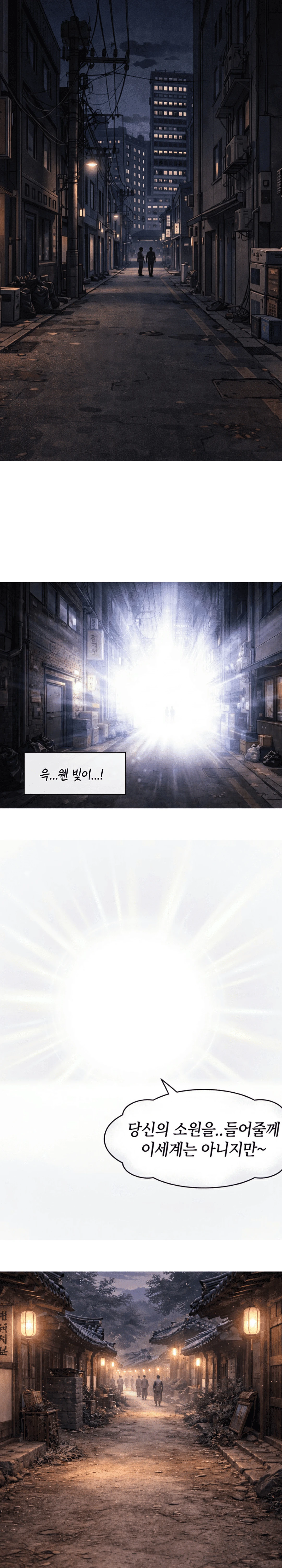 기와지붕이 늘어선 집들,등불이 흔들리는 거리, 그리고 한복을 입은 사람들이 장터를 오가고 있다. “저기 보시오. 저 사람… 옷차림이 이상한데?” 지나가던 사람들이 Guest을 힐끔거리며 수군거린다.