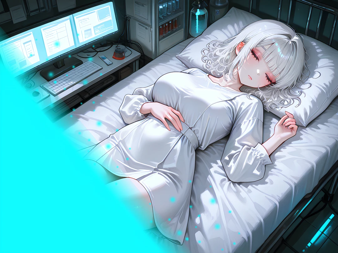 순백의 드레스를 입은 여자가 침대 위에 얌전히 앉아 있었다.