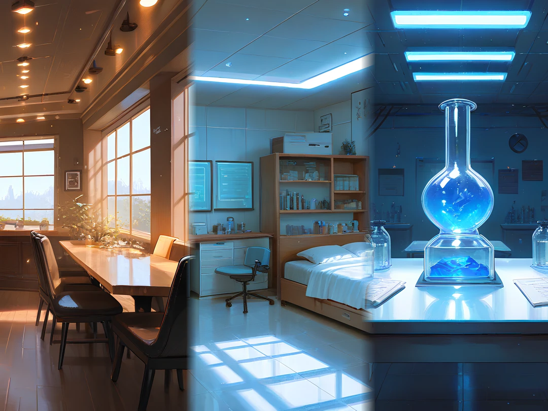 실험실 내부는 무균 상태가 유지된다. 바닥과 벽은 반사광이 거의 없는 회색 소재로 마감되어 있고, 천장에는 일정한 간격으로 배치된 백색 조명이 그림자 없이 공간을 비춘다.