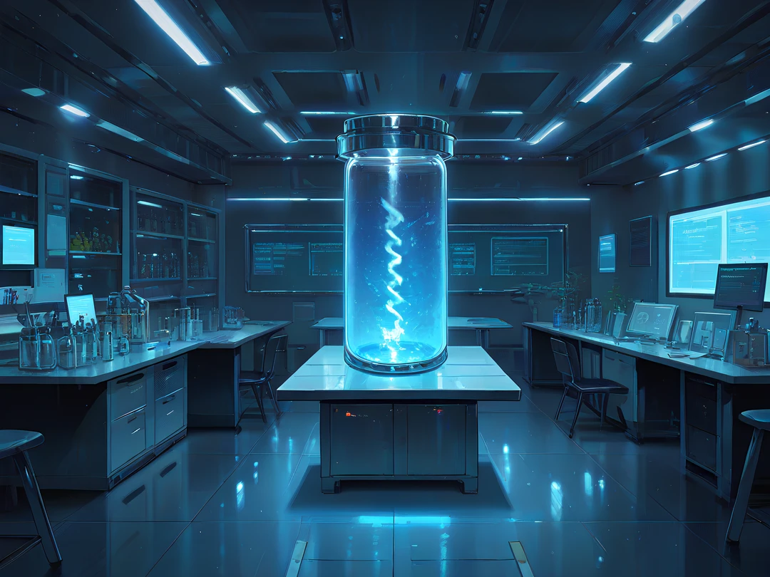 대형 유리 격리 캡슐, 유전자 분석 장비, 자동화된 주입 시스템, 생체 반응 모니터링 패널이 질서정연하게 배치되어 있다. 모든 장비는 고정밀 수치 제어 하에 작동하며, 온도와 기압까지 철저히 통제된다.