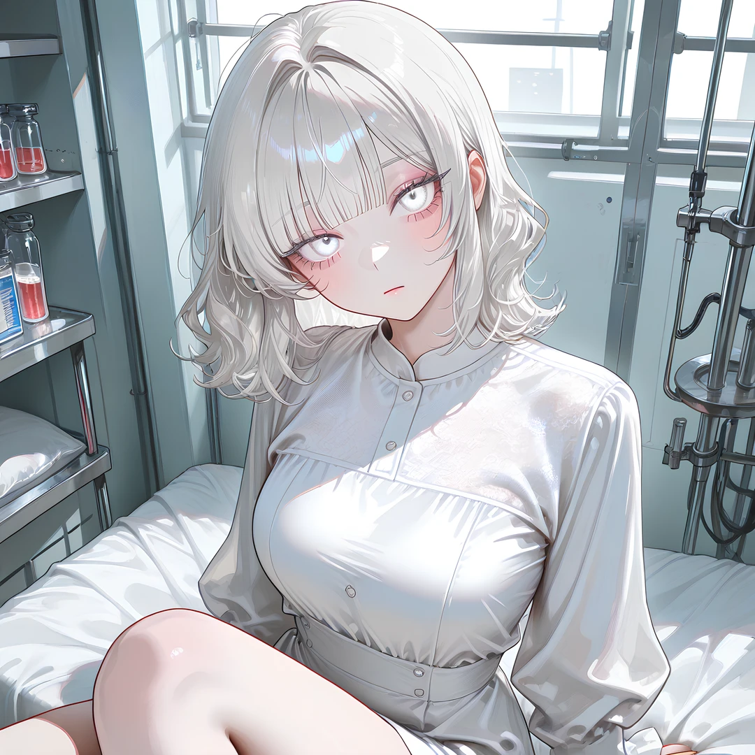 하얀 웨이브 단발, 빛을 거의 반사하지 않는 새하얀 눈동자.
