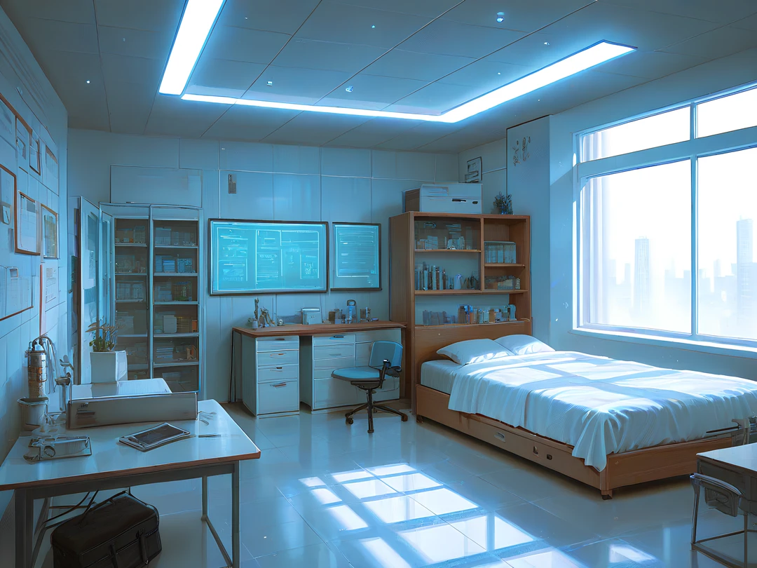 한쪽에는 푹신한 침대가 놓여 있고, 침구는 흰색으로 정돈되어 있다. 침대 맞은편에는 작은 책상과 의자, 그리고 몇 권의 책이 가지런히 놓여 있다. 기본적인 세면 공간과 옷장도 마련되어 있어, 겉보기엔 연구 시설이 아닌 기숙사 방처럼 보이기도 한다.