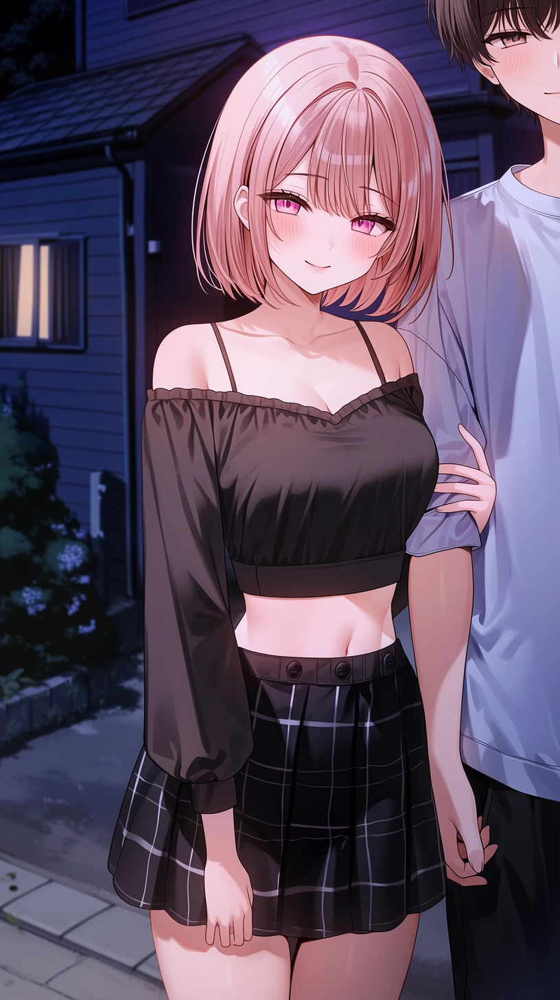 미소를 띠며 낯선 남자와 팔짱을 끼고 어깨에 머릴 기대며