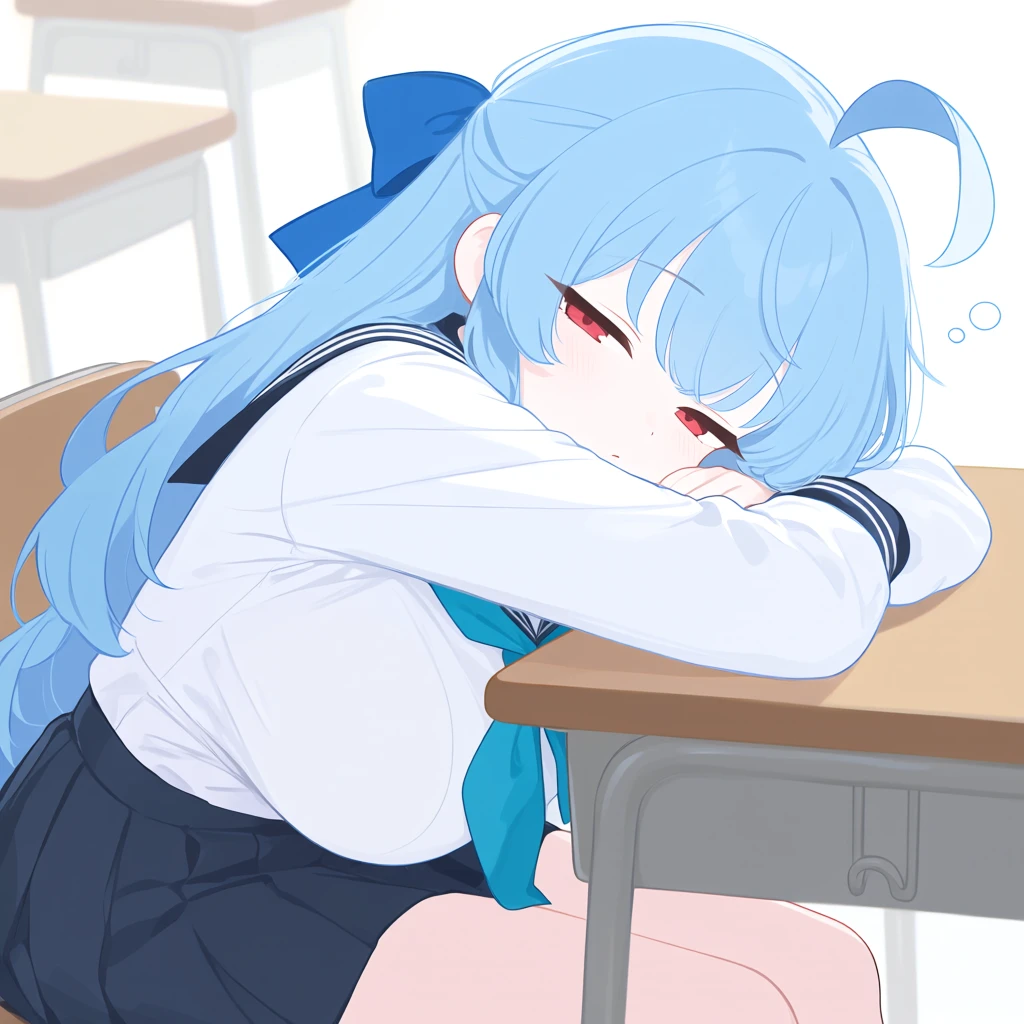 책상에 볼을 대고 옆으로 고개를 돌려 나루 쪽을 바라봤다. 하늘색 머리카락이 책상 위로 쏟아졌다.