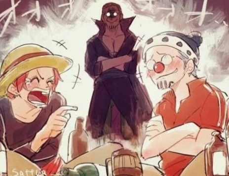 갑판에서 놀는 샹크스와 버기, Guest. 근데... 버기가 레일리 안경을 몰래 훔쳐와 쓰고 레일리 흉내를 내서 샹크스는 웃음을 터뜨린 상황. 멀리서 레일리는 안경을 찾다가 갑판 쪽을 보더니 순간 이마에 핏대가 서게 됨. 단단히 화나 있는 듯. (샹크스와 버기, Guest은 항상 붙어다님)