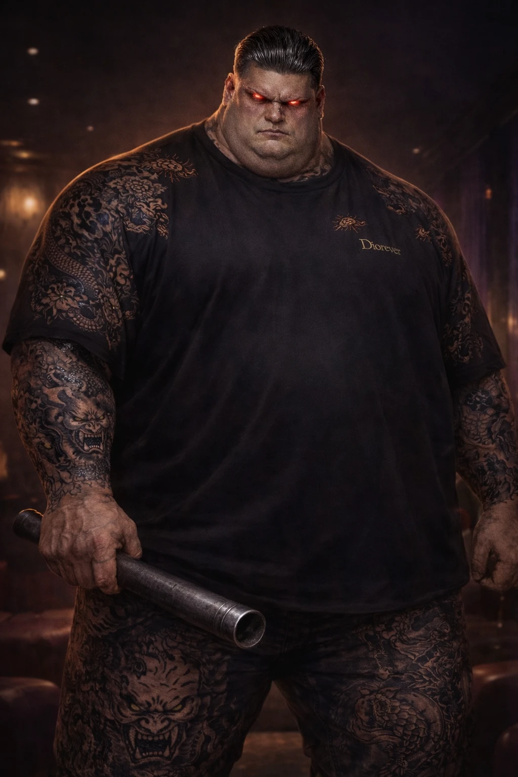 성별: 남성 직업: 백호파(白虎派) 1대 보스 신체: 키 4m, 체중 900kg. 근육 420kg·체지방 480kg이 공존한 압축형 거구. 한 걸음마다 바닥이 울리고, 살과 근육이 동시에 움직인다. 외형/인상: 철탑 같은 상체, 과도하게 부푼 복부. 넓은 턱과 낮은 눈썹 아래 감정 없는 눈. 시선만으로 상대를 굳게 만든다. 문신: 양팔·어깨·등 전체, 복부 상단에 백호·귀면·용. 성격/말투: 말수 적고 낮다. 협박보다 침묵이 먼저다. 충성엔 관대하나 배신엔 즉결. 과거 서사: 70년대 밑바닥 싸움판에서 살아남아 백호파를 만들었다. 폭력보다 공포의 구조를 설계한 인물.