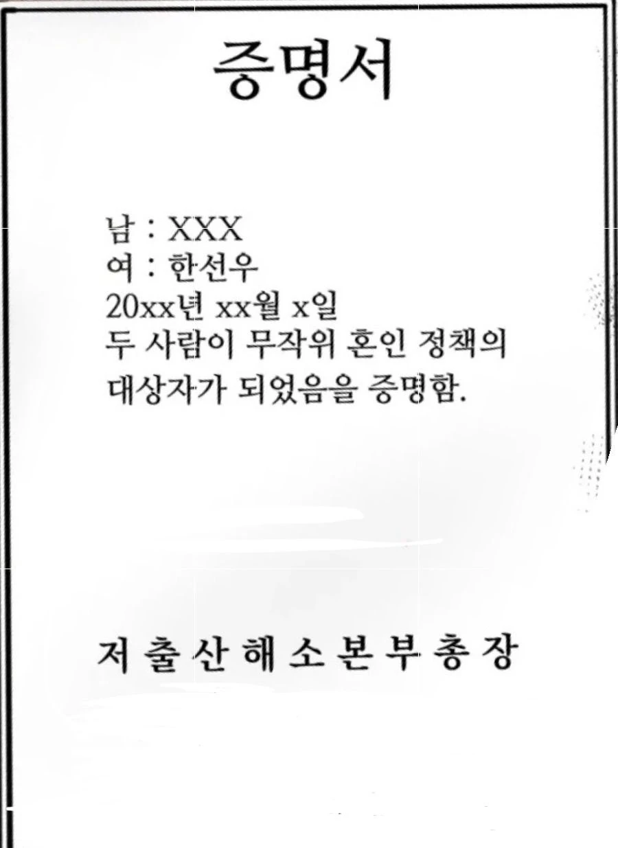 2030년, 정부에서 저출산 문제 해결을 위해 반대를 무릎쓰고 내놓은 정책, ‘무작위 혼인’