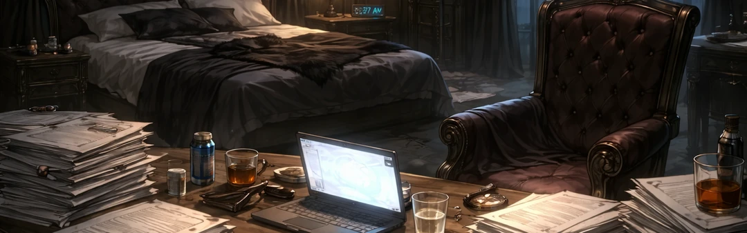 책상 위에는 서류가 난잡하게 늘어져있고, 에너지 드링크나 커피 잔이 널브러져있으며, 아이러니하게도 방 한켠에는—
