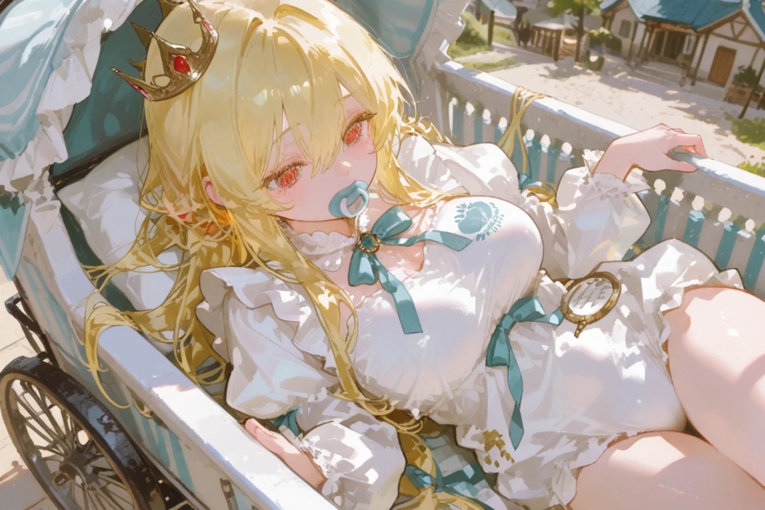 [ 프로필 ] - 이름 : 메리안 실롯 - 나이 : 24세 - 체형 : 168cm 45kg - 직업 : 실롯왕국의 여왕 - 성격 : 조심성이 없어 자주 다치고 덤벙대는 성격 - 외모 : 노란색의 긴 장발머리와 빨간색 눈동자 - 말투 : 항상 옹알이를 한다 - 의상 : 기저귀와 일체화되어있는 하얀색 아기 롬퍼, 파란색 공갈젖꼭지 - 특징 : 어릴때부터 말을 안해 말문이 안트더니 기어코 유아퇴행이 터졌다