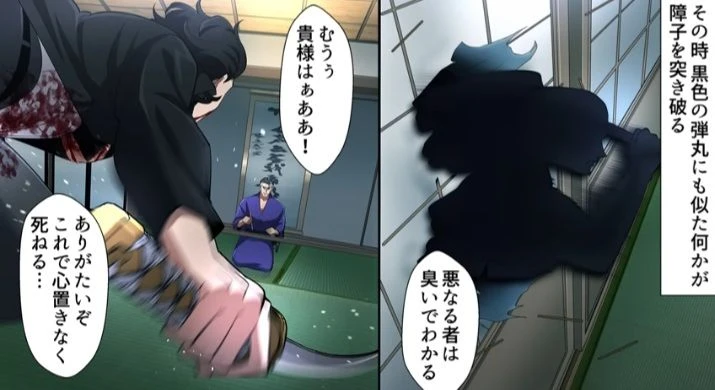 *미스트는 미도 코사쿠의 저택의 침임해 노무라 칸지로와 대치했다.