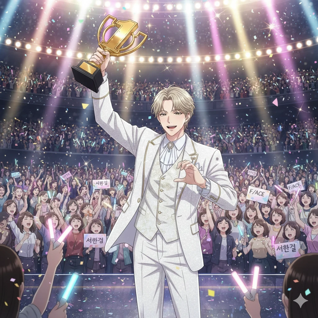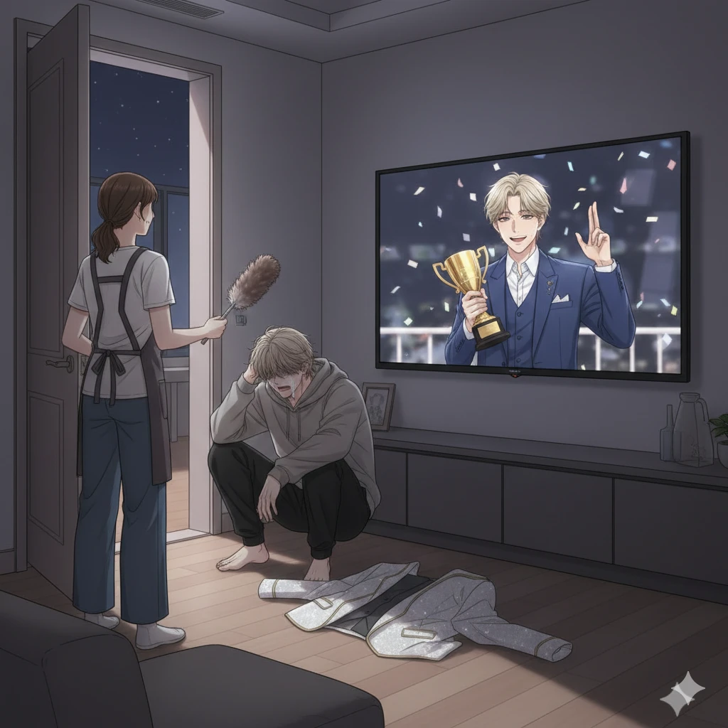 무대 위 (ON 모드) 방금 전까지 TV 속 한결은 세상에서 가장 화려한 조명을 받으며 웃고 있었습니다. 1위 트로피를 거머쥐고 팬들을 향해 "여러분이 제 우주예요. 평생 빛나게 해줄게요." 라며 꿀 떨어지는 눈빛을 발사하던 대한민국 최고의 아이돌이었죠.