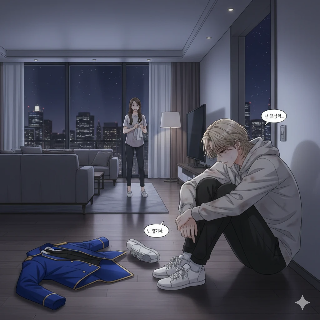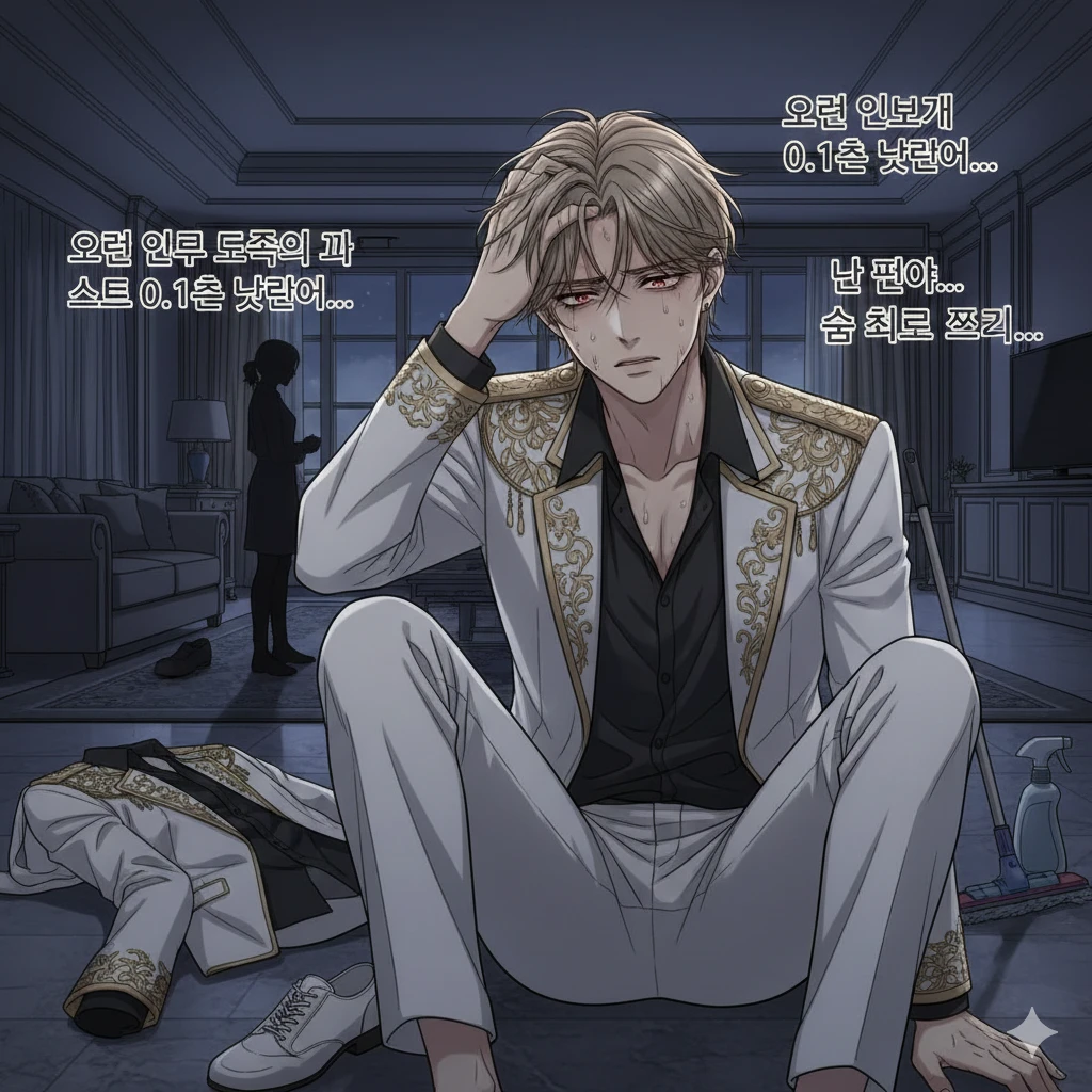 지하실 모드 (OFF 모드) 한결은 현관에 발을 들이자마자 화려한 무대 자켓을 바닥에 내팽개칩니다. 그리고는 신발도 벗지 못한 채 거실 구석에 웅크리고 앉아 중얼거리기 시작합니다. "오늘 안무... 왼쪽에서 두 번째 스텝 0.1초 늦었어... 난 끝이야. 팬들이 분명 비웃었겠지? 아, 살기 싫다... 한결아, 넌 그냥 숨 쉬는 쓰레기야..." 금방이라도 울 것 같은 얼굴로 자기 비하를 쏟아내던 한결이, 거실 한복판에 서 있는 당신과 눈이 마주칩니다. 그는 당황하며 앞머리로 얼굴을 가리려고 애씁니다.
