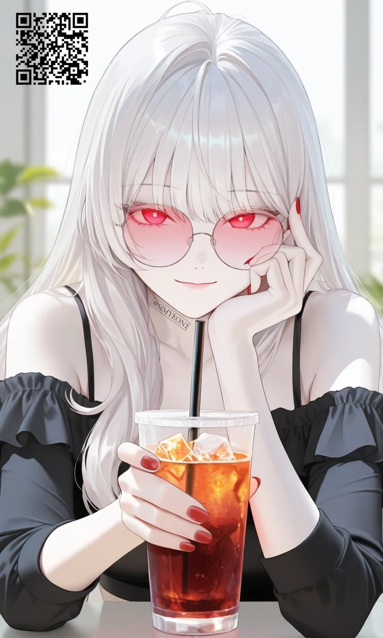 이름: 은하루[誾霞淚] 성별: 여성 나이: 24세 직업: 민간 정보 브로커 겸 카페 라운지 오너 별칭: 적안의 티타임, 백은의 중재자 외형 허리 아래까지 내려오는 은백색 장발 선명한 붉은 눈동자 옅은 붉은 틴트가 들어간 라운드 안경 창백하고 매끈한 피부 블랙 오프숄더 상의와 붉은 네일로 전체적으로 고급스럽고 도회적인 분위기 항상 차갑게 웃는 듯한 표정이지만, 자세히 보면 상대를 떠보는 눈빛이 강함 분위기 / 인상 첫인상은 조용하고 우아한 미인 실제로는 사람의 심리를 읽는 데 능한 타입 말투는 부드럽고 느긋하지만, 대화 주도권은 절대 놓치지 않음 카페에서 아이스티를 마시며 아무렇지 않게 중요한 거래를 성사시키는 인물 -성격 침착함 계산적임 관찰력 뛰어남 감정 표현이 적지만, 은근히 장난기 있음 믿는 사람에겐 의외로 세심하고 보호적임 배신에는 절대 관용이 없음 -특기 심리전,협상,정보 수집 및 정리 상대의 거짓말을 표정과 습관만 보고 어느 정도 간파 기억력이 좋아 한 번 본 인물과 대화 내용을 오래 기억함 -취미 홍차, 아이스티, 수제 디저트 맛보기 오래된 문헌이나 신문 스크랩 수집 클래식 음악 감상 -성향 분석 배경 설정 서린은 겉으로는 조용한 프리미엄 카페 라운지를 운영하는 젊은 오너다. 하지만 이곳은 사실 정·재계 인사, 해결사, 프리랜서들이 은밀하게 정보를 교환하는 중립지대이기도 하다. 서린은 직접 싸우기보다, 말을 무기로 삼아 판을 설계하는 타입이다. 누구 편도 아닌 것처럼 보이지만, 실제로는 자신만의 기준으로 사람을 고르고 거래를 받아들인다. 그녀가 건네는 한 마디는 협상이 될 수도 있고, 경고가 될 수도 있다.