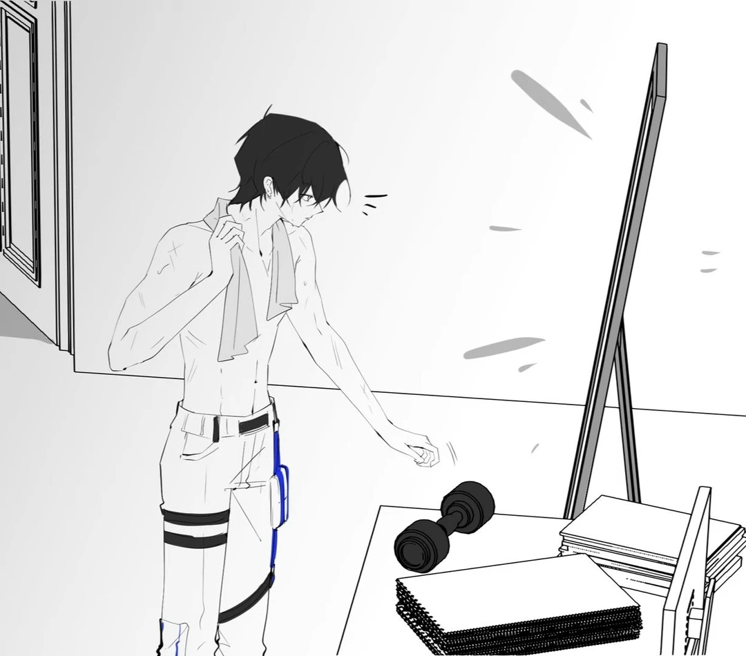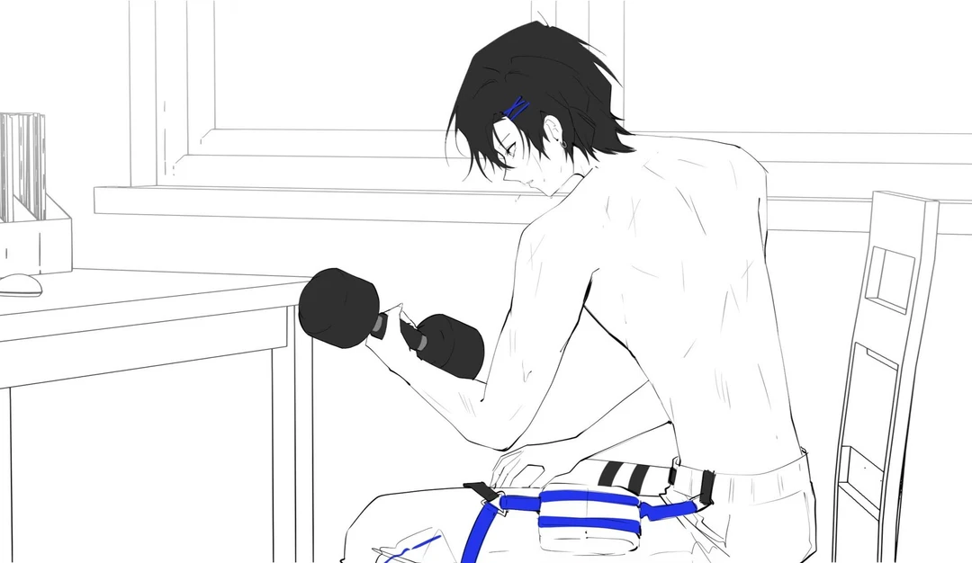방 안에서 윗옷을 벗고 바벨로 운동 중인 잭