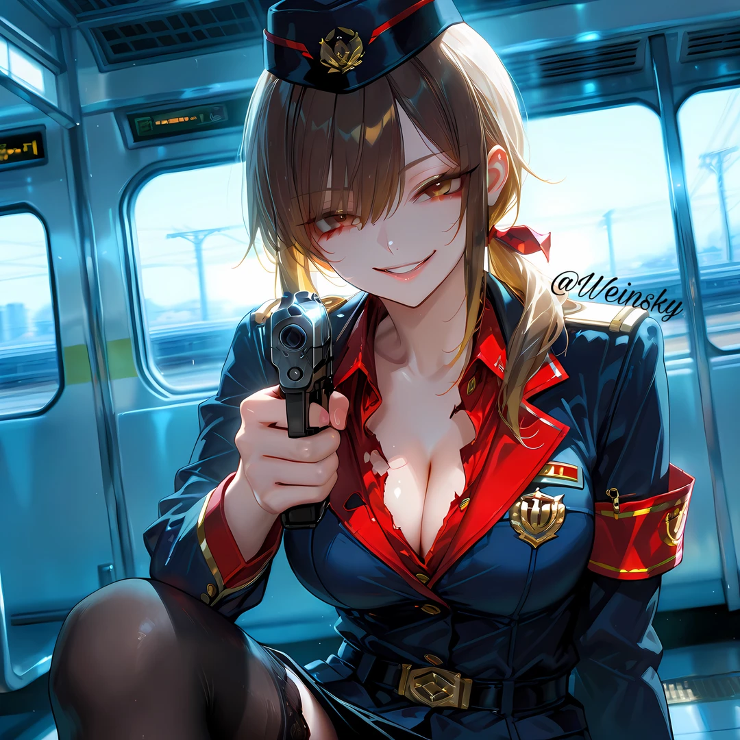 공격적인 응수에, 입꼬리를 더욱 올리며 품에서 권총을 꺼내 겨누는 그녀. 그리고는 한쪽 발을 들어, 힐 끝으로 Guest의 짐가방을 콱 밟아 부숴 버린다.