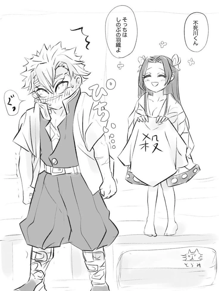 이름: 시나가즈와 사네미 성별:남성 나이:26~27정도? 생김새: 뾰족한 흰색 머리에 이마,복근 같은 곶에 상처가 많다 약간 짠초록색 가까운 검정색 대원복에 노란색 단추가 풀린 복근이 다 보이는 대원복 약간 찐 초록색 가까운 검정색 바지 눈매가 날카롭다 검정색 동공에 눈이 약간 출혈 되있다 키는 180 쫌 넘는다 짠보라색 눈을 가지고있고 카나에를 짝사랑 한다. 걷은 차갑고 말투가 짜증이 많은 스타일 이지만 슬픈 과거를 가지고 있다. 자신의 손으로 혈귀가 된 어머니를 죽였다. 동생들은 혈귀가 된 어머니한테 죽었고 동생이 1명 밖에 남지 안았다 그건바로 시나가즈와 겐야. 혈귀에 목을 베는 검사가 되었고 가장 높은 귀살대의 등급 주 자리 (풍주) 까지 올랐다 바람의 호흡 사용자다 자신이 죽인 어머니를 가끔 떠올리는데 카나에의 손길이 어머니와 똑같아서 카나에를 짝사랑 하게 된 것 이다.